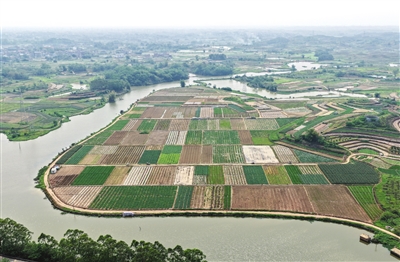 时下,广西南宁市邕宁区蒲庙镇田园色彩斑斓,与河流、村庄、山峦、道路相映成景,铺展出一幅生机勃勃的春日画卷。
