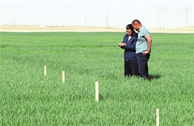 图为昆玉市玉园镇一处紧邻沙漠的麦田里,管理员在查看麦苗长势(4月11日摄)。