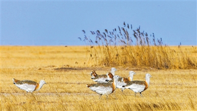 近日,国家一级保护动物大鸨现身黑龙江省林甸县的草原。大鸨是鹤形目鸨科大型地栖鸟类,主要栖息于开阔的平原、干旱草原、稀树草原和半荒漠地区,被列入《世界自然保护联盟濒危物种红色名录》和《中国濒危动物红皮书》。 新华社发