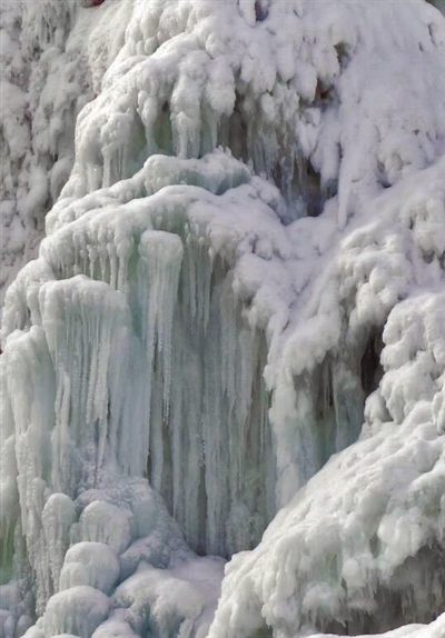 我惊奇于这冰瀑,奔流的水,几下子就被寒冷干净利索地摁住了。惯性依然,纵然凝固了,却始终保持着流动的样子。由流动到静止,由无形到有形,再由柔软到坚硬,这是水在寒冷条件下的宿命。有无奈,却透着生机。