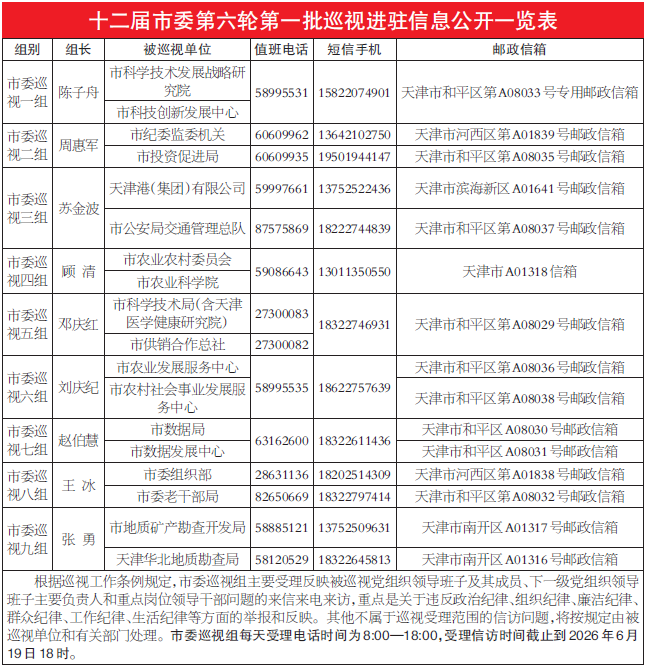 本报讯(记者 徐丽)根据市委部署,截至4月21日,十二届市委第六轮第一批巡视的9个市委巡视组已完成进驻,将对17个市级党政机关、市管事业单位党组织开展常规巡视,并对天津港(集团)有限公司党委和市公安局交通管理总队(交通管理局)党委开展巡视“回头看”,现场巡视时间2个月。
