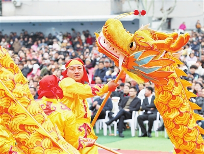 图为2月28日,舞龙队在浙江省湖州市德清县乾元镇第26届浙北乾龙灯会上巡游展演。