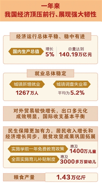 一年来,我国经济顶压前行、展现强大韧性。经济运行总体平稳、稳中有进,国内生产总值增长5%,总量达到140.19万亿元。就业总体稳定,城镇新增就业1267万人,城镇调查失业率平均为5.2%。对外贸易较快增长,出口多元化成效明显,国际收支基本平衡。民生保障更加有力,居民收入增长和经济增长同步,脱贫攻坚成果巩固拓展,实施学前一年免费教育政策、惠及1400万儿童,全面实施育儿补贴制度、惠及3000多万婴幼儿。粮食产量达到1.43万亿斤。重点领域风险化解取得积极进展,社会大局保持稳定。