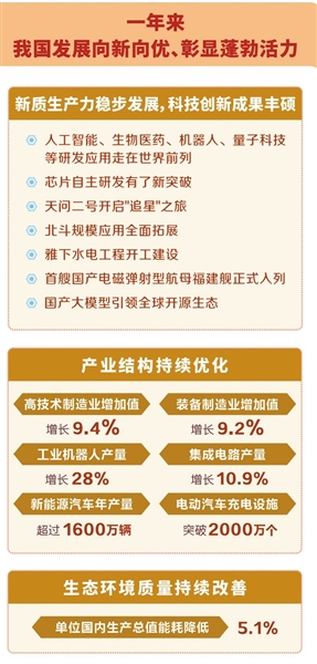 一年来,我国发展向新向优、彰显蓬勃活力。新质生产力稳步发展,科技创新成果丰硕,人工智能、生物医药、机器人、量子科技等研发应用走在世界前列,芯片自主研发有了新突破,天问二号开启“追星”之旅,北斗规模应用全面拓展,雅下水电工程开工建设,首艘国产电磁弹射型航母福建舰正式入列,国产大模型引领全球开源生态。产业结构持续优化,高技术制造业、装备制造业增加值分别增长9.4%、9.2%,工业机器人、集成电路产量分别增长28%、10.9%,新能源汽车年产量超过1600万辆,电动汽车充电设施突破2000万个。单位国内生产总值能耗降低5.1%,生态环境质量持续改善。
