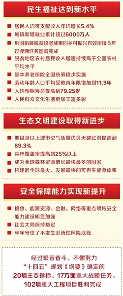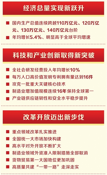 经济总量实现新跃升,国内生产总值连续跨越110万亿元、120万亿元、130万亿元、140万亿元台阶,年均增长5.4%、明显高于全球平均增速。科技和产业创新取得新突破,全社会研发经费投入年均增长10%,每万人口高价值发明专利拥有量达到16件,攻克一批重大关键核心技术,制造业增加值规模连续16年保持全球第一,产业链供应链韧性和安全水平稳步提升。改革开放迈出新步伐,重点领域改革扎实推进,全国统一大市场加快构建,高水平对外开放不断扩大,制造业领域外资准入限制措施全部取消,货物贸易第一大国地位更加巩固,高质量共建“一带一路”走深走实。民生福祉达到新水平,居民人均可支配收入年均增长5.4%,城镇新增就业累计超过6000万人,巩固拓展脱贫攻坚成果同乡村振兴有效衔接5年过渡期任务圆满完成,脱贫地区农村居民收入增速持续高于全国农村平均水平,基本养老保险全国统筹稳步实施,劳动年龄人口平均受教育年限增加到11.3年,人均预期寿命提高到79.25岁,人民群众文化生活更加丰富多彩。生态文明建设取得新进步,地级及以上城市空气质量优良天数比例提高到89.3%,森林覆盖率提高到25%以上,成为全球森林资源增长最快最多的国家,构建起全球最大、发展最快的可再生能源体系。安全保障能力实现新提升,粮食、能源资源、金融、网络等重点领域安全能力建设明显加强,社会大局保持稳定,牢牢守住了不发生系统性风险底线。经过艰苦奋斗、不懈努力,“十四五”规划《纲要》确定的20项主要指标、17方面重大战略任务、102项重大工程项目胜利完成。