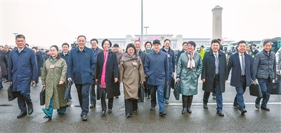 出席十四届全国人大四次会议的天津代表团代表步入人民大会堂。