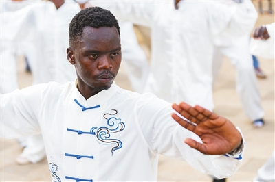 3月18日,当地学生在肯尼亚内罗毕大学孔子学院习练太极拳。在首个“国际太极拳日”到来之际,肯尼亚内罗毕大学孔子学院通过讲授太极拳历史及相关文化知识、组织学生习练太极拳等活动,传播中华优秀传统文化,促进中肯人文交流。