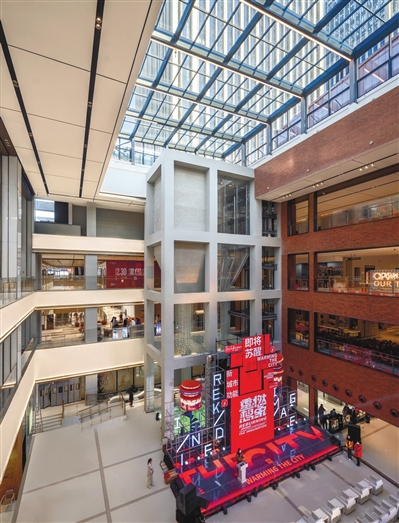 要让改造后的老厂房能顺利变身为现代商业空间,首先要解决的关键问题,就是如何让新建筑与老厂房“和平共处”。既要严格遵守文物保护的规定,又要让空间满足商业运营的实际需求,这中间的平衡该怎么找?为此,方案设计团队在更新方案中大胆采用“时空交错”的玻璃盒子结构作为连接体,协调新、旧建筑在体量与风格上的差异。这一大尺度的透明空间,既延续了老厂房的工业肌理,又以轻盈的现代语言建立起新旧对话关系,在碰撞中展现艺术张力,最终实现了保护与发展的平衡。