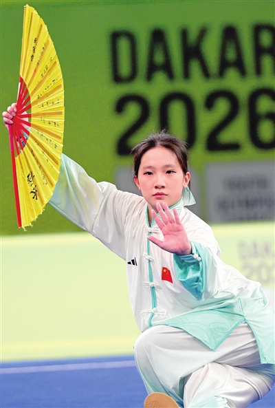 在备受关注的女子A组(15—17岁)太极扇决赛中,中国队选手汪静宜展现出相当高的水准。她动作刚柔并济,将太极拳的舒缓与太极扇的灵动完美融合,扇影翻飞间节奏把控精准,难度动作高质量完成,最终以9.260的高分锁定冠军。此前,她作为本届赛事运动员代表,在开幕式上完成宣誓。