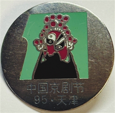 1995年11月,首届中国京剧艺术节在天津举办。为此发行的“中国京剧节·95·天津”纪念章,采用不锈钢材质制作,呈现出镜面银白色调,视觉上干净利落,理性沉稳。章面中部设计出一块略显敦厚的“1”字形状的绿色作为底色,衬托出一个黑、红、银白色调相间的适度变形的组合式脸谱,颇显新意,反映出京剧艺术的丰富多彩和变化无穷。
