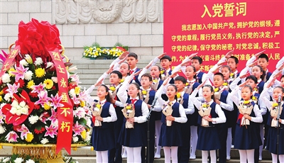 面向党旗、团旗、队旗,全体党员、共青团员、少先队员重温入党、入团、入队誓词。各主办单位负责同志向革命烈士敬献花篮并整理挽联。青年党员、共青团员、少先队员依次瞻仰人民英雄纪念碑并献花。