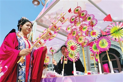 在和平区区级非物质文化遗产代表性项目“富贵”绒花制作技艺展位上,一件件融合传统技艺和新工艺的绒花发饰,泛着特有的柔和光泽。“这朵‘海棠仿绒花’简直能以假乱真!”几位年轻女孩一边试戴,一边兴奋地自拍。市民李彤也爱不释手:“以前觉得绒花是‘老古董’,没想到它也能这么时尚。”该项目代表性传承人秦琦介绍:“这是我们特意为海棠花节设计的产品,就是要让老手艺‘开出’新花朵。”话音未落,又一位顾客扫码付款,小小的展位前围满了寻找“春日信物”的游人。