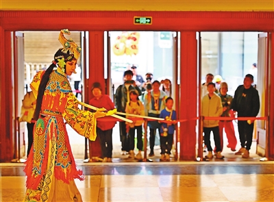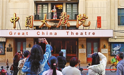 清明假期,中国大戏院举办的京剧快闪活动吸引了市民和游客驻足欣赏。