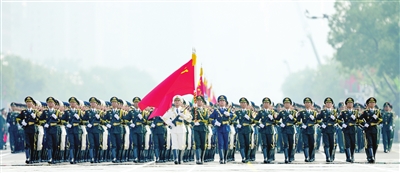 受阅部队最前方,中国共产党党旗、中华人民共和国国旗、中国人民解放军军旗在仪仗方队护卫下迎风招展。
