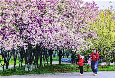 近日,海河教育园区内连片海棠花树织就诗意花廊。市民漫步花下,感受春日美好。