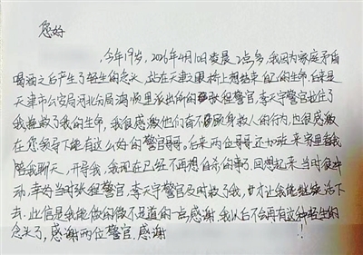 事后,女孩通过天津市公安局的局长信箱,发来了一封手写感谢信。张程看到信后很欣慰:“信里说,经过我们的疏导,她已经没有轻生的念头了。这个让我特别开心——救人最怕的就是救完以后她又去做过激的事。”