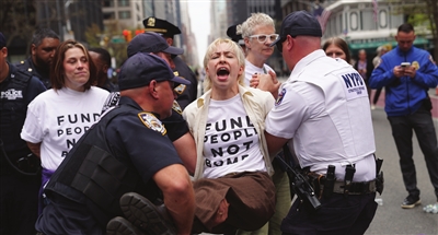 4月13日,在美国纽约曼哈顿,一名参加抗议活动的女子被警察控制。