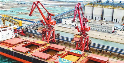 本报讯(记者 陈璠 摄影 吴迪)日前,随着中控室下达进仓指令,码头门机落料,后方皮带机开动,首批粮食平稳入仓,天津临港现代粮食物流产业园区粮食仓储物流集散中心项目顺利启动了设备带料重载调试和压仓作业,标志该项目已具备粮食接收、存储、输送等核心功能,为后续正式投产运营打下坚实基础。