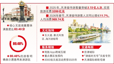 近年来,依托得天独厚的文旅资源、精细化暖心服务、四通八达的交通网络,天津文旅市场持续焕发活力,游客满意度稳步攀升。据天津市消费者协会发布的文旅商圈满意度调查报告显示,核心文旅商圈整体满意度达83.40分,80.48%的游客明确表示愿意再次来津游玩。