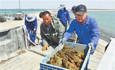 近日,天津汉沽盐场盐田海参迎来春季捕捞季。依托5800亩生态养殖基地,预计本季总产量可达10万斤左右。 记者 周伟 摄